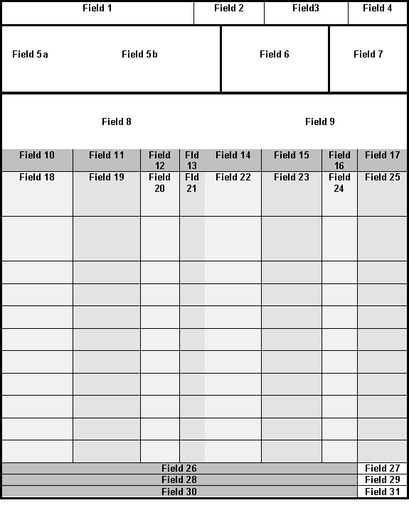 The forms that follow are intended to provide a template for forms used between trading partners. The content and layout of these forms represent the minimum acceptable for common usage. The model is shown with field designations; i.e. Field 1, Field 2… The fields are explained in the following section. The forms provided are: Purchase Order, Packing list / Manifest, Invoice.