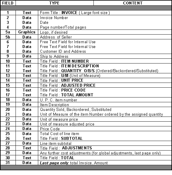 The forms that follow are intended to provide a template for forms used between trading partners. The content and layout of these forms represent the minimum acceptable for common usage. The model is shown with field designations; i.e. Field 1, Field 2… The fields are explained in the following section. The forms provided are: Purchase Order, Packing list / Manifest, Invoice.