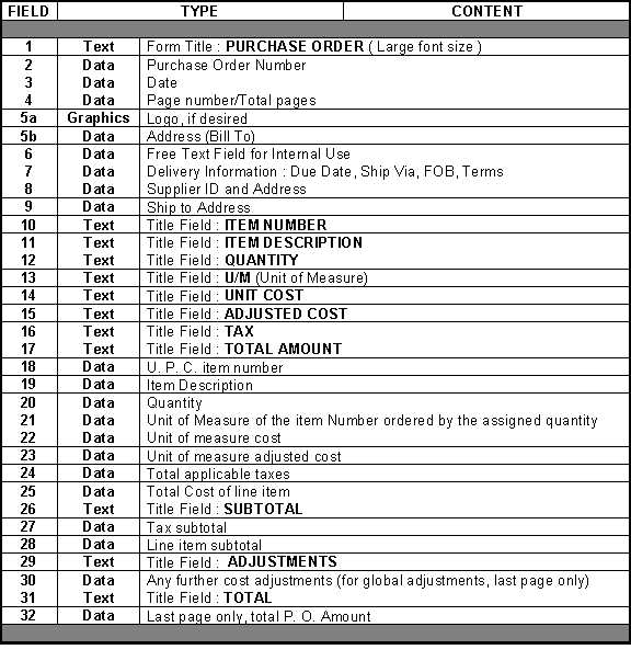 The forms that follow are intended to provide a template for forms used between trading partners. The content and layout of these forms represent the minimum acceptable for common usage. The model is shown with field designations; i.e. Field 1, Field 2… The fields are explained in the following section. The forms provided are: Purchase Order, Packing list / Manifest, Invoice.